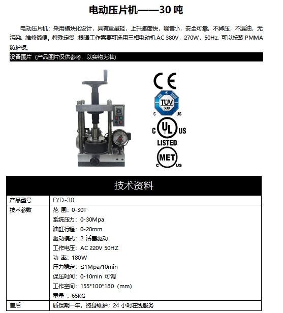 電動(dòng)壓片機(jī):采用模塊化設(shè)計(jì),具有重量輕,上升速度快,噪音小,安全可靠,不掉壓,不漏油,無污染,維修簡便。特殊定貨 :根據(jù)工作需要可選用三相電動(dòng)機(jī)AC 380V,270W,50Hz. 可以按裝PMMA防護(hù)板。